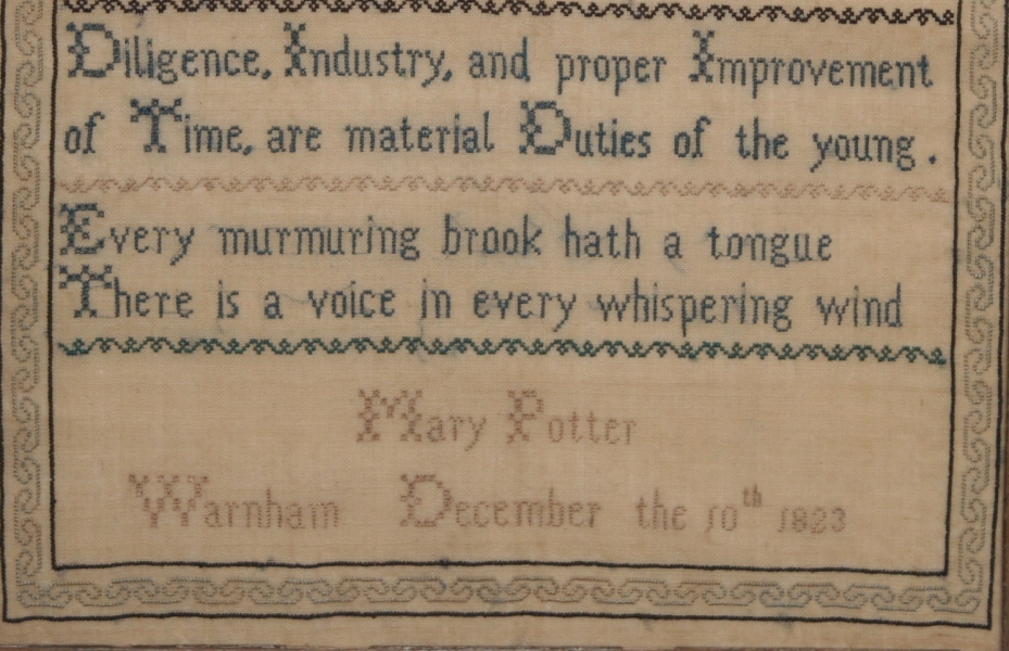 There is possibly nothing more personal in sampler than those commemorating the family. In this case the Children of Benjamin & Mary Potter of Warnham in West Sussex. This sampler worked by Mary the oldest child and only daughter. We particularly like the two short verses.