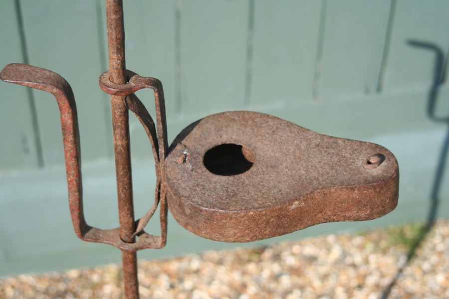 A rare standing oil lamp probably Scottish the simple black smith made flat tripod base with shaped feet stands a sinle stem with an adjustable spring oil lamp of large size. This was made for fish / whale oil .