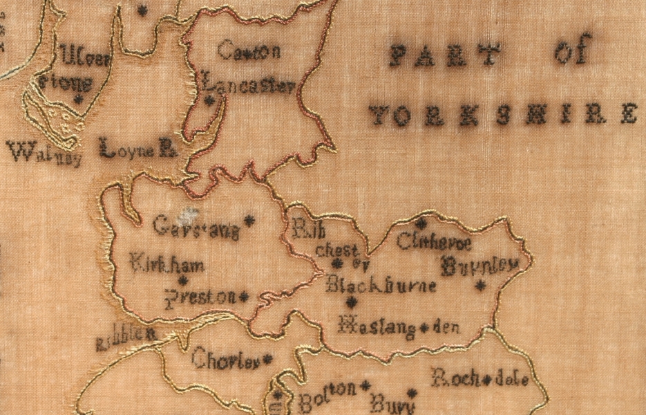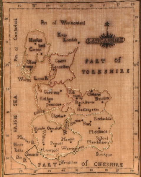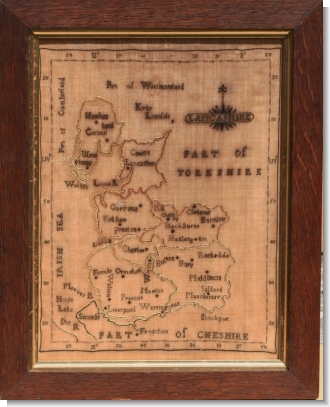 A rare small map of LANCASHIRE worked in black silk on a silk ground.