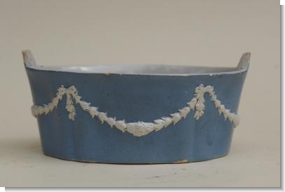 an early nineteenth century English pearlware (Perhaps Leeds) butter tub c1810-25. The form rather charming and moderately unusual, the oval body applied with very crisply moulded swags of husks, issuing from ribbon tied floret pendants reserved against a powder blue ground with two integral angular handles as shown. The piece measures 5 7/8 inches long, is 4 3/8 inches wide and stands 2 5/8 inches tall. Condition: excellent, one handle with a small shallow chip and a tiny touch in, two minute chips to rim, otherwise excellent and as clearly pictured (occasional small frit to ground colour |