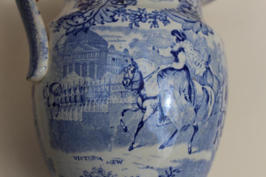 In 1838 When Queen Victoria had succeeded to the Throne It was arranged that there would be a great review of the troops in Hyde Park resulted in an amusing tiff with Lord Melbourne . The Queen insisted she would appear on horse back, The Prime minister thought this was indecorous and unladylike, tempers flared, harsh words were spoken and it was reported in the Times....The Queens words on the subject '''remember no horse, no review''' The review took place on horse back but at Windsor not Hyde Park as illustrated on this jug.