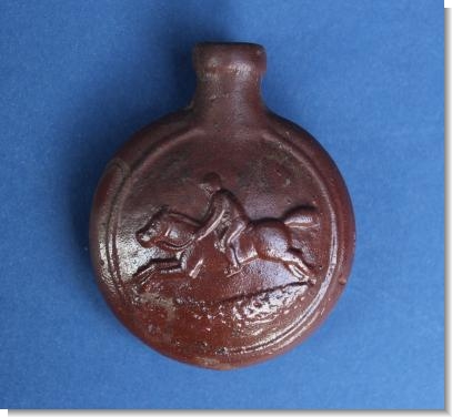 An interesting piece of early to mid 19th century saltglaze. A perfume or scent bottle, moulded with a racing horse on one side. The image is very similar to that found ( although two horses) on white stone ware jugs of c.1820,