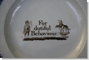 A wonderful early pearlware plate with blue feather edge. Transfer printed to the center with "FOR DUTIFUL BEHAVIOUR" for performing the duties expected or required of one ! I'm not sure that this required a reward , a bit like tipping your hair dresser for doing a good job, or the taxi driver for driving you to your destination safely !. |