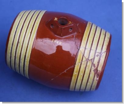 A very rare incised named and dated slipware barrel from Sussex,. The classic red clay body has bands of yellow slip around each end to look like the willow on a wooden barrel. Around the stopper at the top we have the initials RN incised into the clay, below this the date 1842. This form of decoration is characteristic of the Sussex potters around Rye.