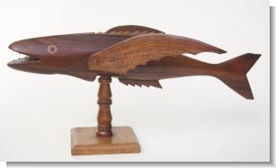 A lovely classic carved fish by JACOB WARREN signed on one wing, the other with full inscription Souvenir from Pitcairn Island home of the mutineers of HMS Bounty landed Jan 23 1790.Length 15 inches 38 cm