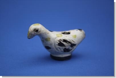 A rare early 19th century pearlware bird whistle decorated in Pratt like colours.