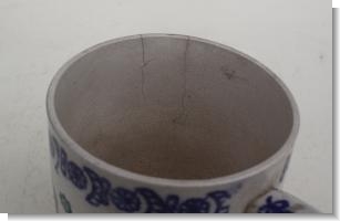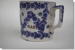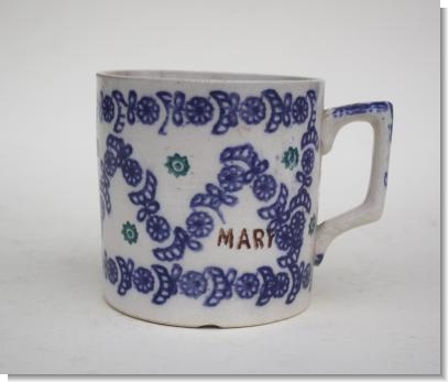 The only "named" spongeware mug we have ever seen. Printed in three colours, blue with green flowers and the name in brown.