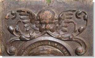 An unusual mid 16th century Romayne panel depicting a central roundel with a portrait of a gentleman in contempory dress hat. Above this an Angel is flying.