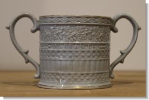 A very rare and unusual form, Usually in an earthenware pearlware body often attributed to Fell although other makers made them I have not come across a solid blue body nor a loving cup containing a blue frog.