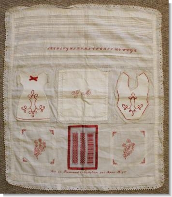 An interesting and unusual late 19th century School sampler by Anna Meyer , "Made at the Boarding School Gyseghem" .