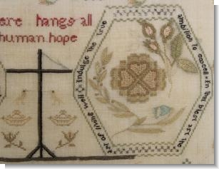 At the top a pair of hexagonal panels with short statements of virtues, have not only flowers stitched but the pencil drawings our Elizabeth had made before stitching her sampler.