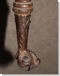 Turned oak legs with cast iron feet with glass balls. The upholstered seat, the underside with cast makers mark on the adjustment screw .