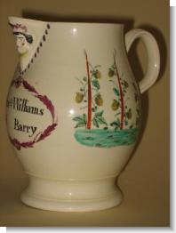 Most interestinfg Staffordshire Ale Jug of circa 1780.. The mask spout is usualy associated with firms like Greatbatch although other makers probably produced similar.. The jug decorated in overglaze enamels has a central cartouce with the inscription JOHN WILLIAMS of BARRY . On one side we have a single flower, the other three hop poles . So we have a Staffordshire creamware Jug produced for someone in Wales advertising Kent hops ( Barges and ships worked around the coast taking Welsh slate to Kent and returning with Wool and Hops).