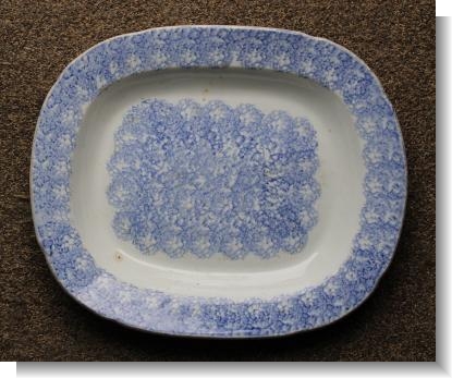 STRIKING FLOW BLUE & SPONGE DECORATED PLATTER.