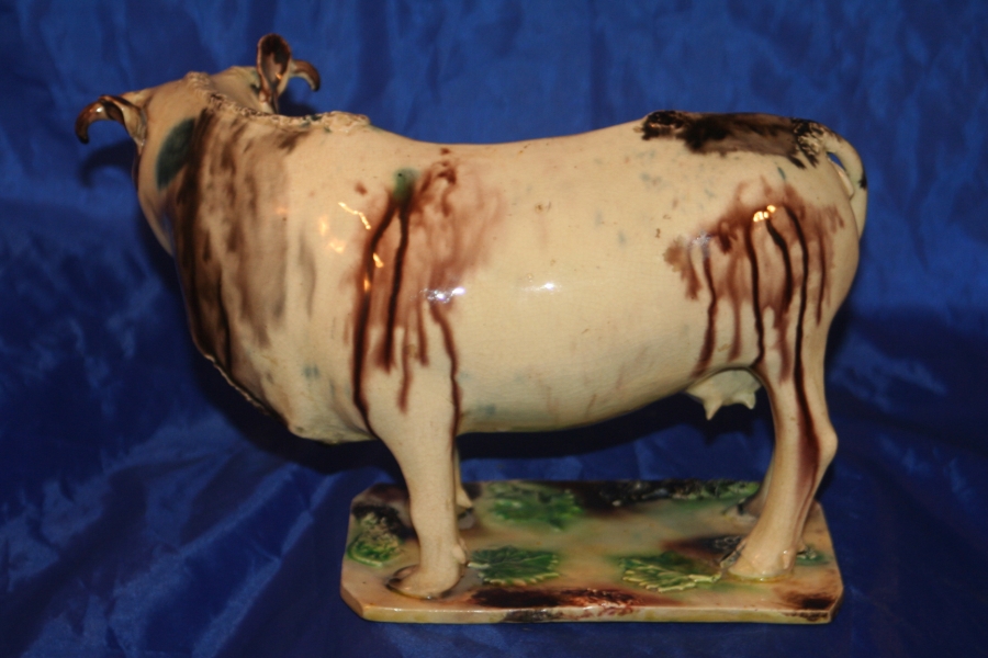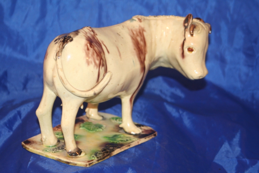 A Staffordshire or possibly Devon creamware model of a Bull, decorated in the Whieldon Style. Late 18th Century.