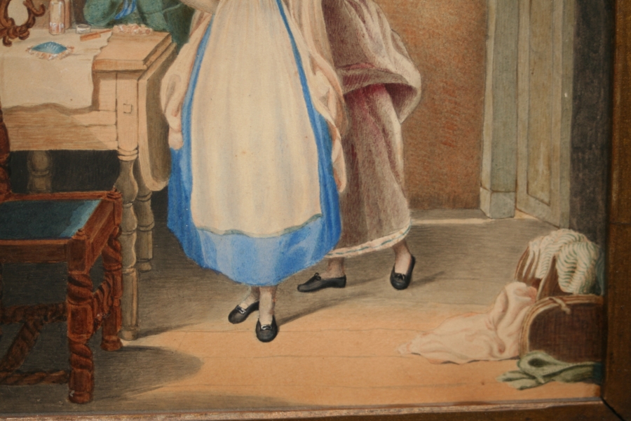 I do not know the origin of this delightful early 19th century water colour, Northern Europe, possibly Flemish from the style of the furniture. retaining its original giltwood frame this charming early 19th century water colour depicts a young woman getting dressed with her maids. I think although very well painted it retains a certain charm.
