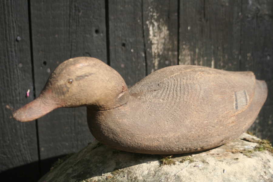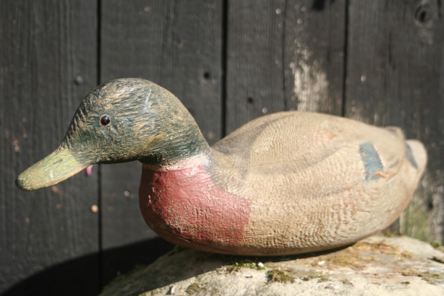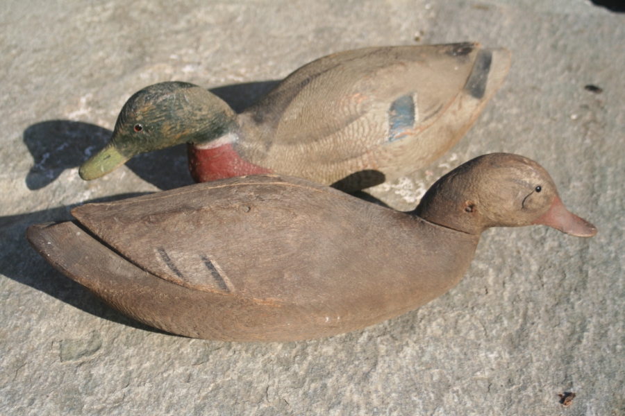 Rare pair of mallard decoy ducks in swimming mode with there heads stretched forward.