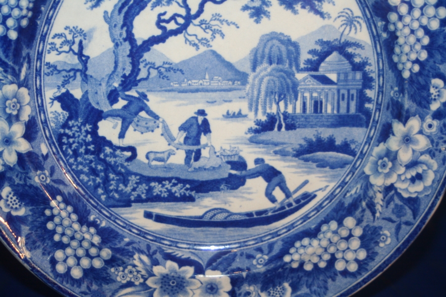 Transfer printed in a deep blue with the pattern known as Fisherman with Nets. There is a man in a boat as well as two others handling a net in a tree, an English style Pagodas Temple in the back ground the other side of the large lake.