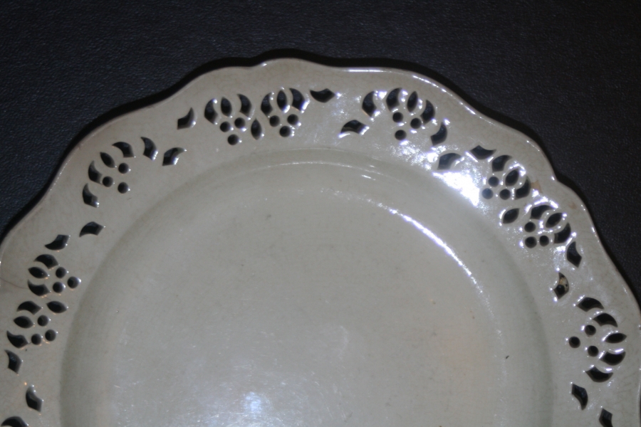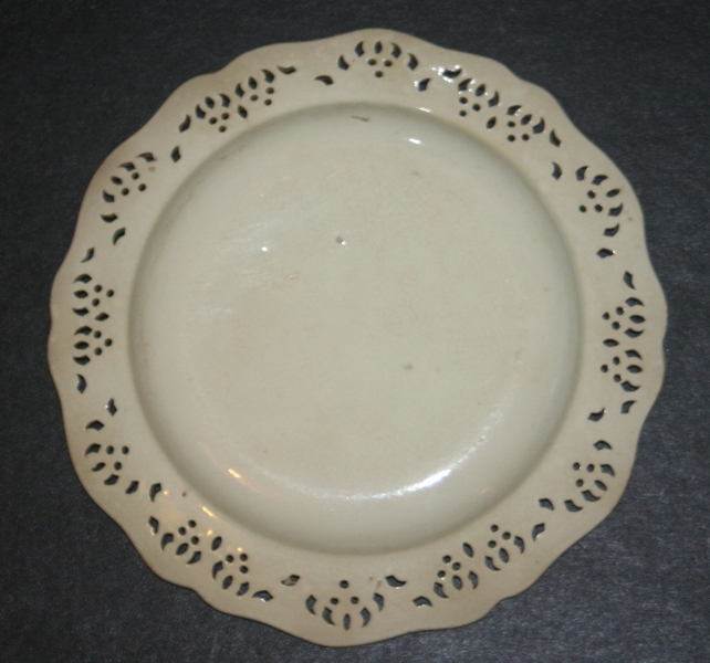 Quite rare size are the small pierced desert plates, This particular one of Queens shape measures only 7 inches, with a pierced pattern around the border, one can clearly see the variation in the repeated pattern were the piercing was done by hand.