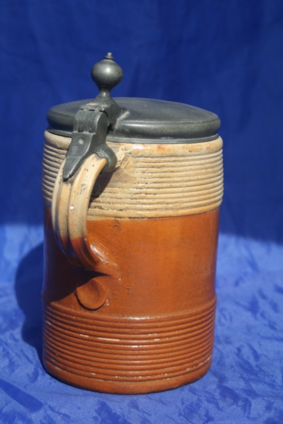 A rare 18th Century Saltglaze Stoneware Tankard or STIEN as I think it would preferred to be called. The banded form a standard style in northern Europe including England is decorated with a white slip around the top bands. I believe this may be German or one of the low countries like Belgium or Holland