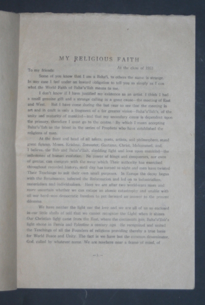 It is an explanation of Leaches acceptance of the Baha\'i faith and is signed by Leach at the end of the text in pencil, and so has very much the feeling of aprinted letter.