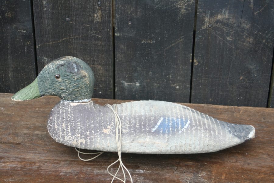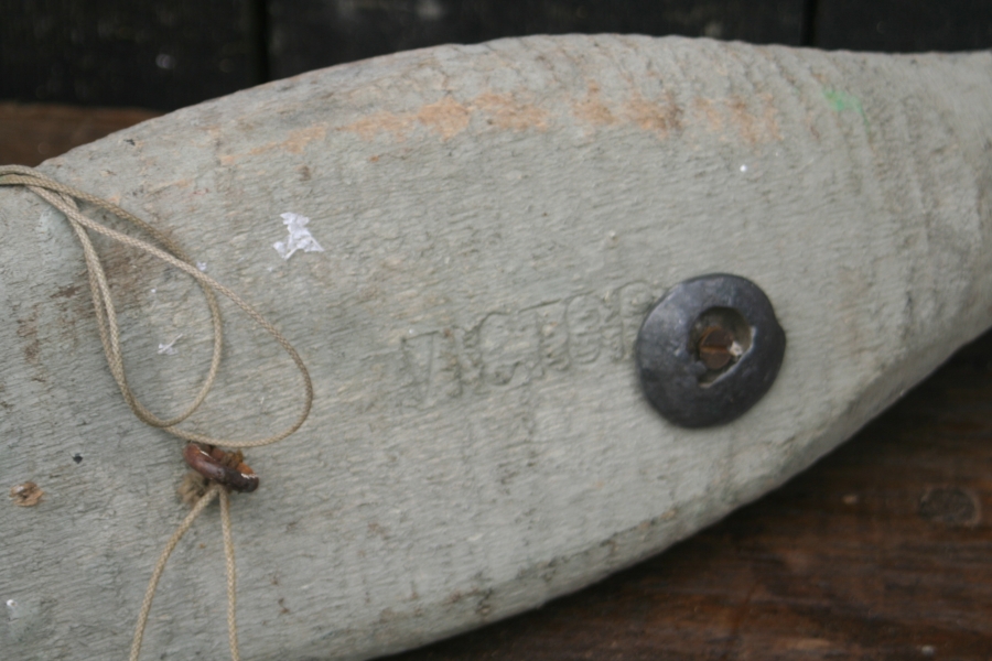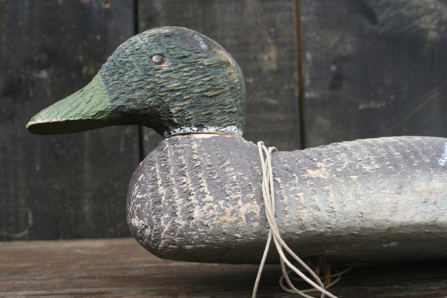 An interesting carved and turned wood decoy duck, a Mallard Drake probably from the early 20th Century. One of a number that would have been used as a "raft" behind a shooting boat to attract other ducks. The body roughly turned on a lathe giving the texture of feathers, the head carved and fixed. Original glass eyes. The base with old weights and hook has an impressed name VICTOR upon it.