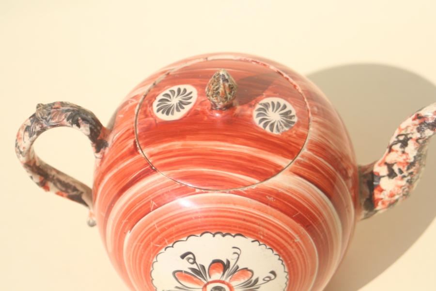 A very rare 18th Century Wedgwood creamware teapot and cover decorated with a red target like pattern.