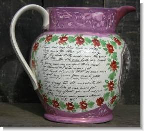 This is a unique and impressive jug standing 24 cm tall at the spout, hand painted with a verse about shooting owls.Restored chip to spout, well done.