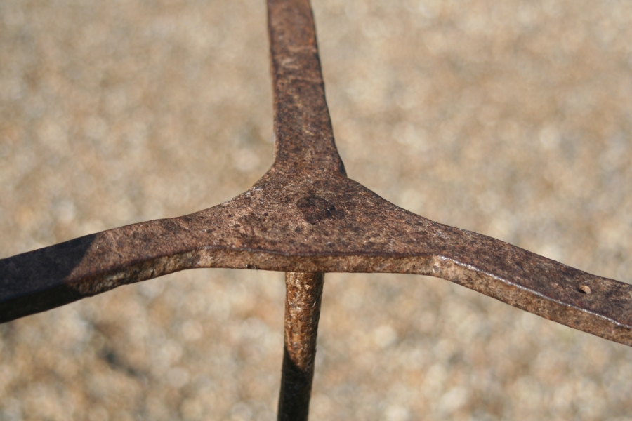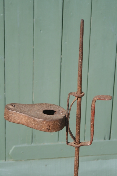A rare standing oil lamp probably Scottish the simple black smith made flat tripod base with shaped feet stands a sinle stem with an adjustable spring oil lamp of large size. This was made for fish / whale oil .