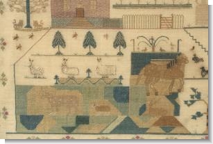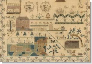 .An exceptional sampler by Elizabeth Smith dated 1814, depicting just about everything, including her farmhouse with a large naturalistic horse, ships and boats under a bridge.
