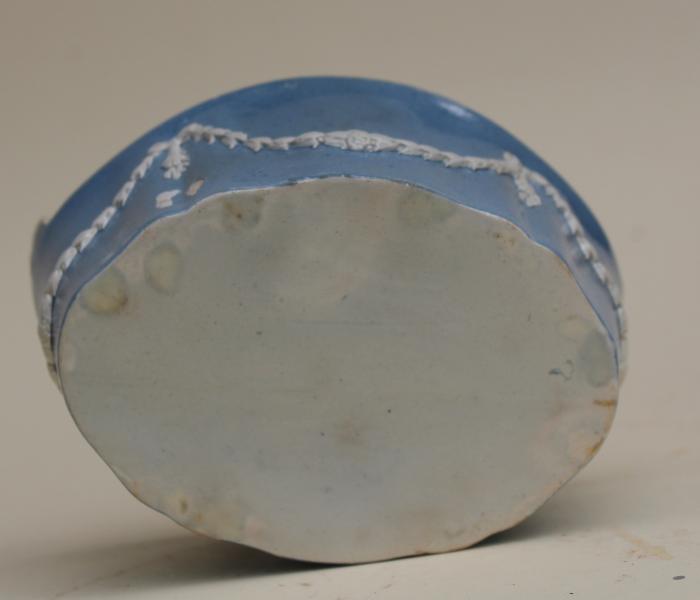 an early nineteenth century English pearlware (Perhaps Leeds) butter tub c1810-25. The form rather charming and moderately unusual, the oval body applied with very crisply moulded swags of husks, issuing from ribbon tied floret pendants reserved against a powder blue ground with two integral angular handles as shown. The piece measures 5 7/8 inches long, is 4 3/8 inches wide and stands 2 5/8 inches tall. Condition: excellent, one handle with a small shallow chip and a tiny touch in, two minute chips to rim, otherwise excellent and as clearly pictured (occasional small frit to ground colour |