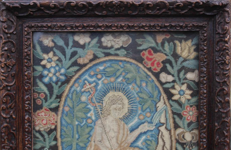 A wonderful canvas worked panel , depicting John The Baptist in a central oval, surrounded by a border of flowers against a black ground.