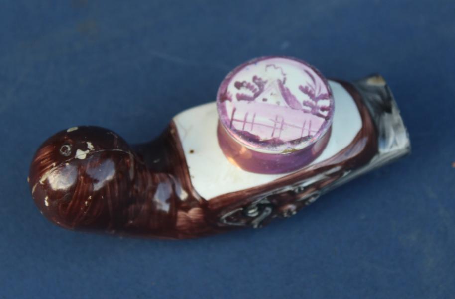 An interesting early 19th Century Snuff box, with both luster and enamel decoration. The form ihas been copied from a Pewter Snuff box. I would think Staffordshire not Sunderland luster, c.1820. The Pink luster cap unscrews.