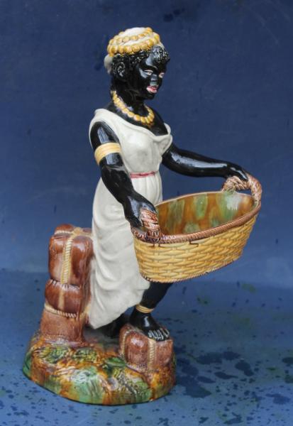 A large 19th century Blackmore figure in majolica pottery. The female figure dressed not in traditional dress but in a simple European / American style dress possibly second hand of the type traditionally worn by Slaves and Estate workers. |