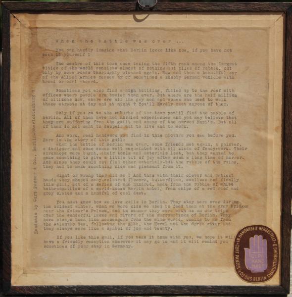 : : : This is the story of these butterflies: they were made during the summer 1945 in Berlin piece after piece by the clever and patient hands of men and women, who had no paints and brushes to work with and no canvas or paper to work on, but were ready to do most everything. Thus the light blue colour of this butterfly is made from the tiles of a fine delicatessen store on "Potsdamer Platz" and the red brown from the bricks of an old building of "Wilhelmstrasse".