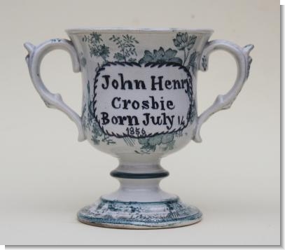 Oh what a delightful story this mug can tell. made to commemorate the birth of John Henry on July 14 1856 . Transfer printed in green with three frogs moulded on the inside.