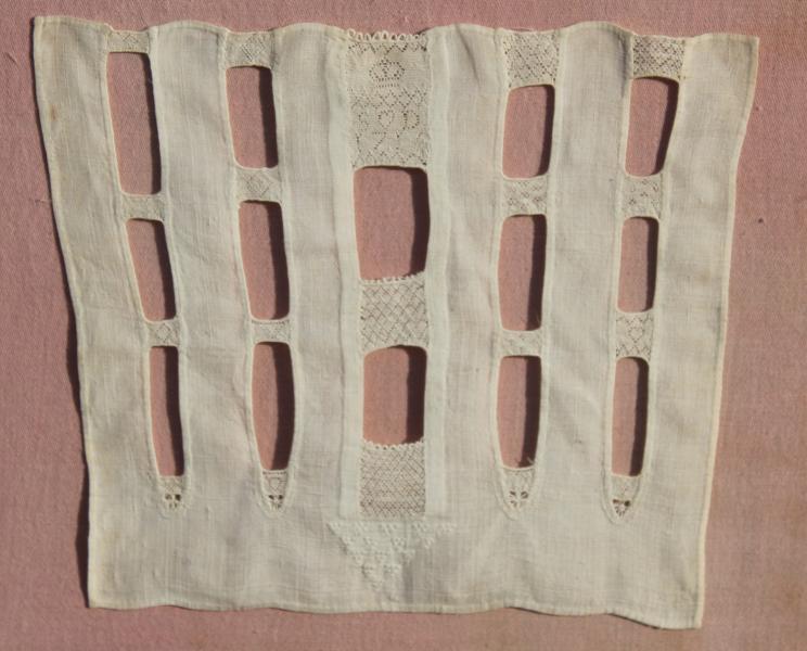 Hollie point has always been more or a domestic, rather than a professional. It was used primarily on baby clothes in the 18th and early 19th century, especially, christening sets. The lace was stitched in the crown of baby bonnets, or caps, and sometimes on a band that extended from the centre front of the cap to the nape of the neck. The shoulder seams of small shirts were decorated with initials, dates, and mottoes as demonstrated on this sampler. Signed and initialed S D 1716 to the top central panel with a variety of motifs in the linking panels.