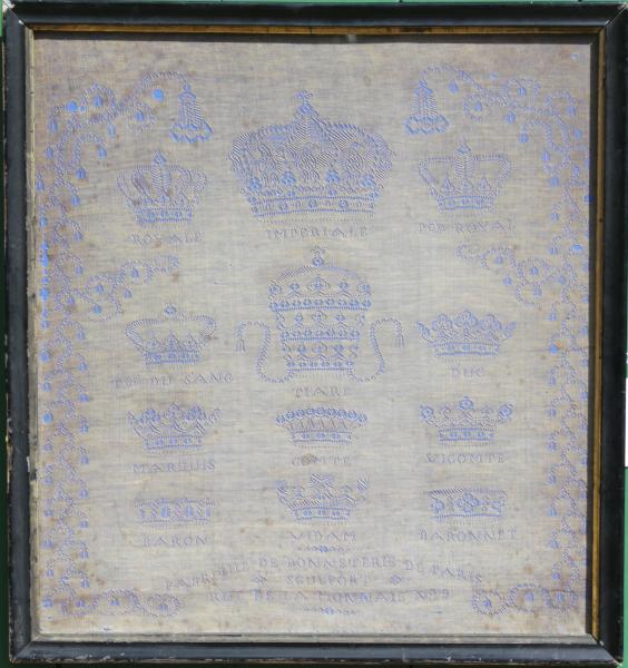 We have never seen a sampler like this exceptional whitework. Signed AH and dated 1857 it is inscribed FABRIQUE DE BONNETERIE DE PARIS, SOUTFORT, RUE DE LA MONNAIE No.9 (PARIS HOSIERY FACTORY, SOUTFORT, RUE DE LA MONNAIE).