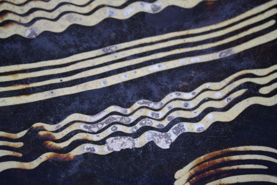 A good late 18th century slipware pie or baking dish decorated in an unusual pattern of lines.