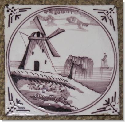 A very interesting and rare 18th Century tile depicting a windmill on a shore with a weeping willow tree and boat on the water. I don't think I have seen this before, the symbolism of this tile is very interesting, the obvious weeping willow, usually and commonly associated with memorials and death and with a boat that represents the journey to the after life. The Windmill and its association with Bread can represent Christ.