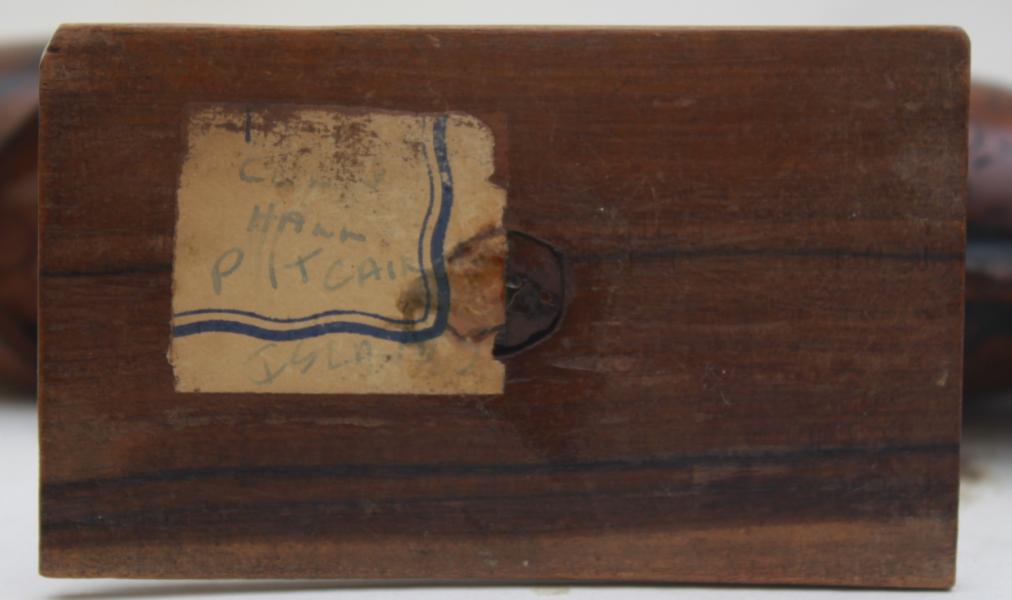 interesting fish inscribed to the side in the traditional style FROM PITCAIRN ISLAND, the other side blank. Old paper label has the name COLIN HALL. Pitcairn Island .