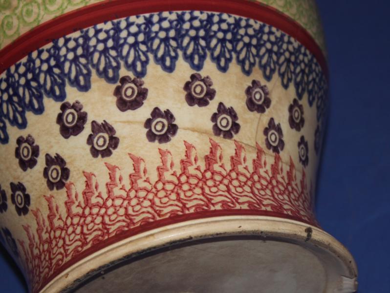 Very rare large piece of sponge ware. Decorated in four colours and including 8 bands of decoration. A very impresive piece.