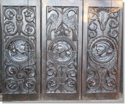 This set of three panels came out of some framework in this order. The first panel clearly depicting JAMES I, his hat having the emblems of Scotland & England. The other two panels depicting male figures, the first Germanic with the double headed eagle, the third having an unusual bulls head.