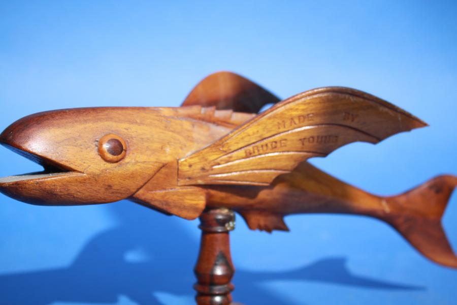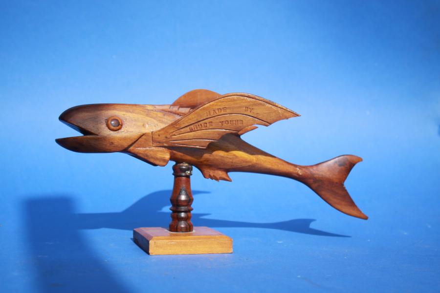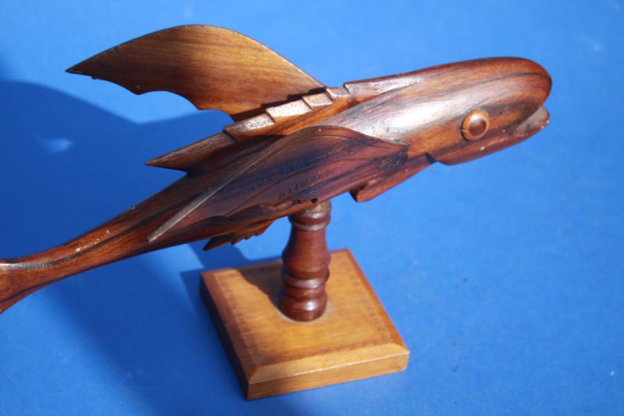 Good Pitcairn island carved flying fish by Bruce Young with large bulging eyes,