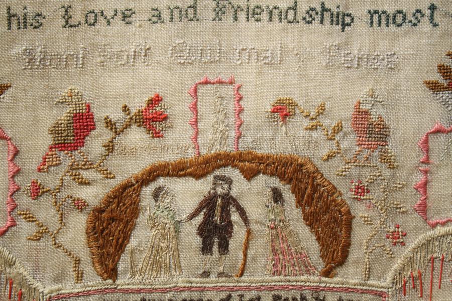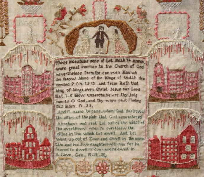 Remember Lots wife , is the title of this very unusual probably Welsh sampler, by Eliza Jones in 1830.