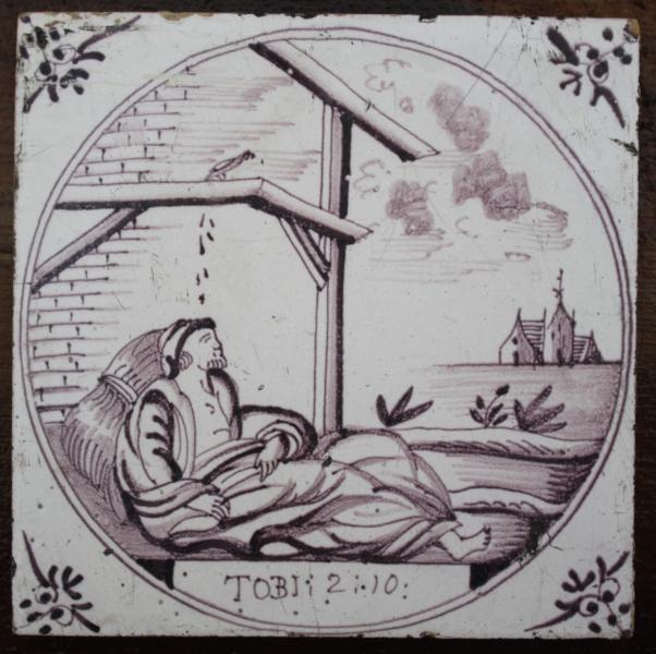 On this tile we have TOBI 2:10 After Sennacherib's death, Tobit is allowed to return to Nineveh, where he buries a man who has been murdered on the street. That night, he sleeps in the open and is blinded by bird droppings which fall into his eyes. The blindness caused by this injury strains his marriage and, ultimately, he prays for death