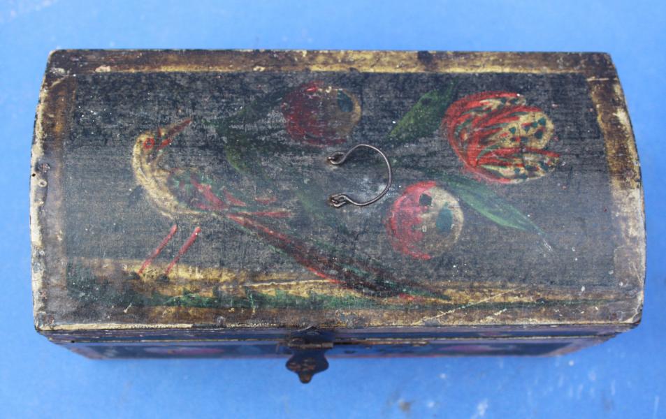 This has an unusual bird on the lid, rather than the flowers and fruit, that appear on the front great small size with original metal work.