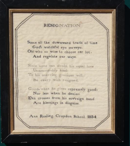 A very rare Quaker sampler from the Croydon School by Ann Rosling 1834.