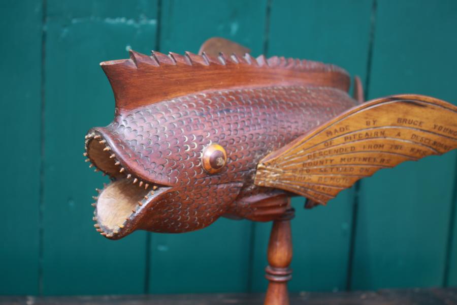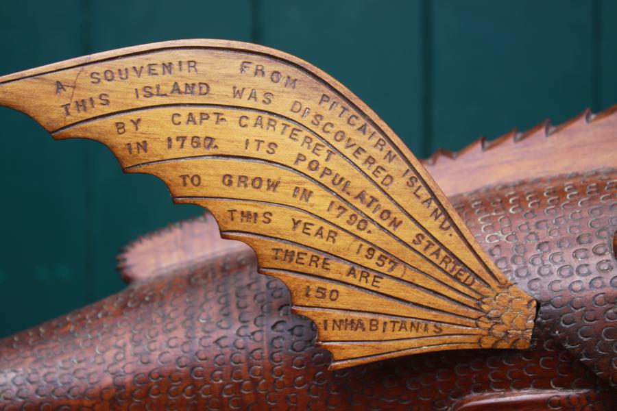 Truly an exceptional beast with a wonderful curving body, fully inscribed wings telling the full story, Signed Bruce Young & dated 1957, only the second fish we have seen dated. 18 1/2 inches long 47 cm and 27 cm high.