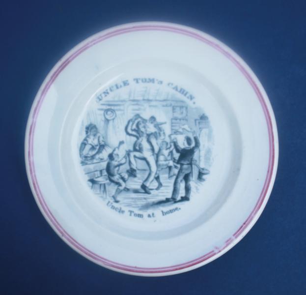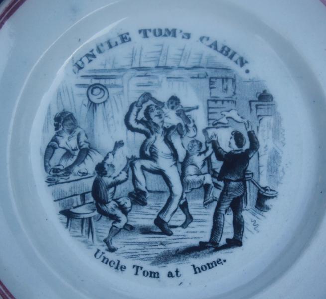 An antique transfer printed pearlware plate with an image produced by the famous British illustrator George Cruikshank for American writer Harriet Beecher Stowe's anti slavery novel Uncle Tom's Cabin that was first published in book form in 1852.